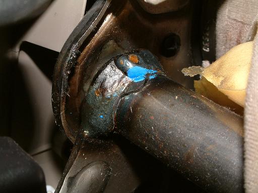 Closeup view of driver's seat rear crossbeam showing crack at weld on left side: