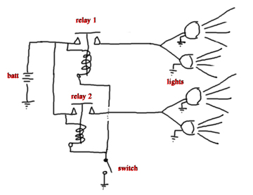Make sure the wire from +/- 12V to the relay and from the relay to the lights is heavy enough for the load. The wire to and from the switch can be light duty.