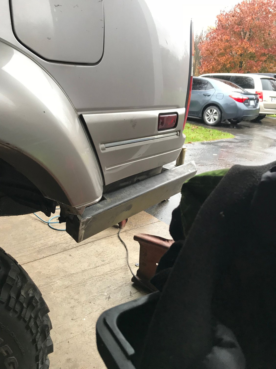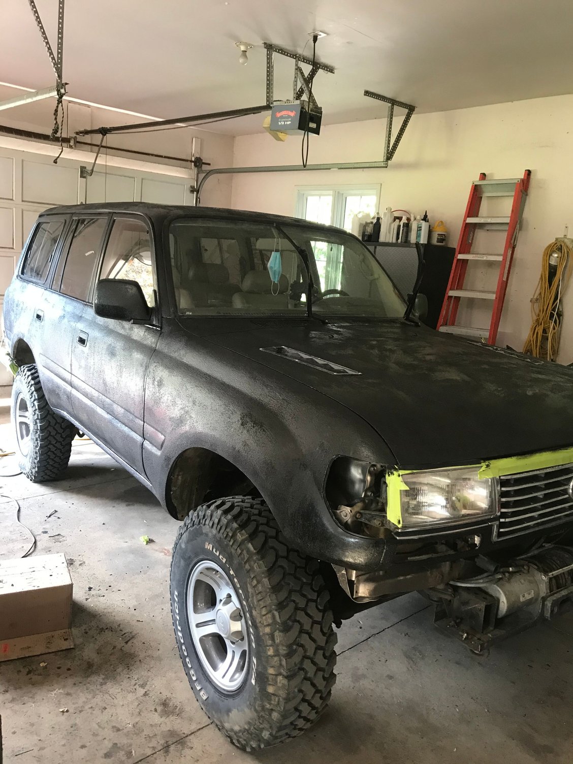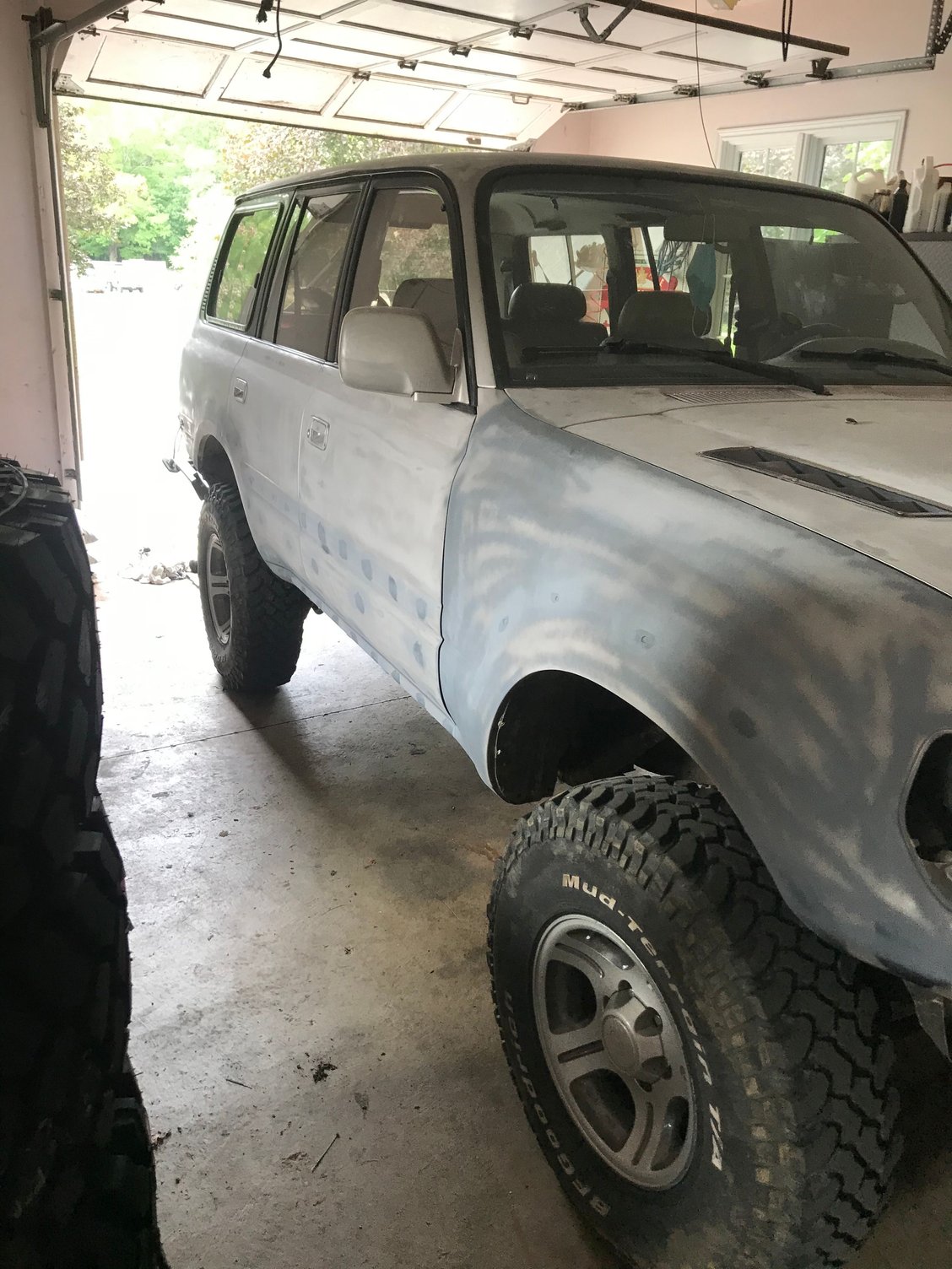 Loaded up Tore a flare off on a wheeling trip New 315/75r16 Firestone destination mt2 Tearing one flare off lead to this.... 130 holes filled, primed and ready for... Bedliner. Final product