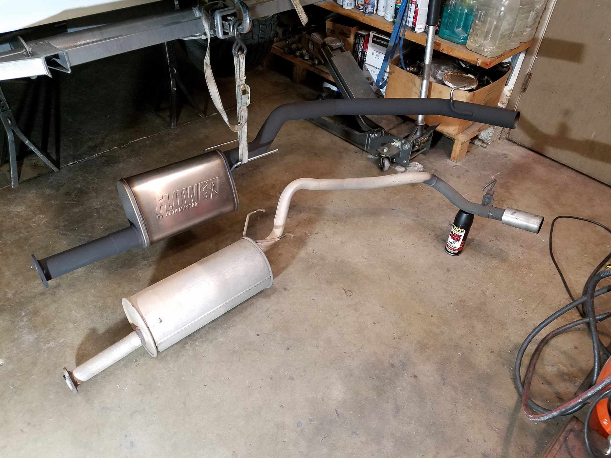 Fabricated exhaust system incorporating a FlowMaster P/N: 71236, FlowFX muffler.