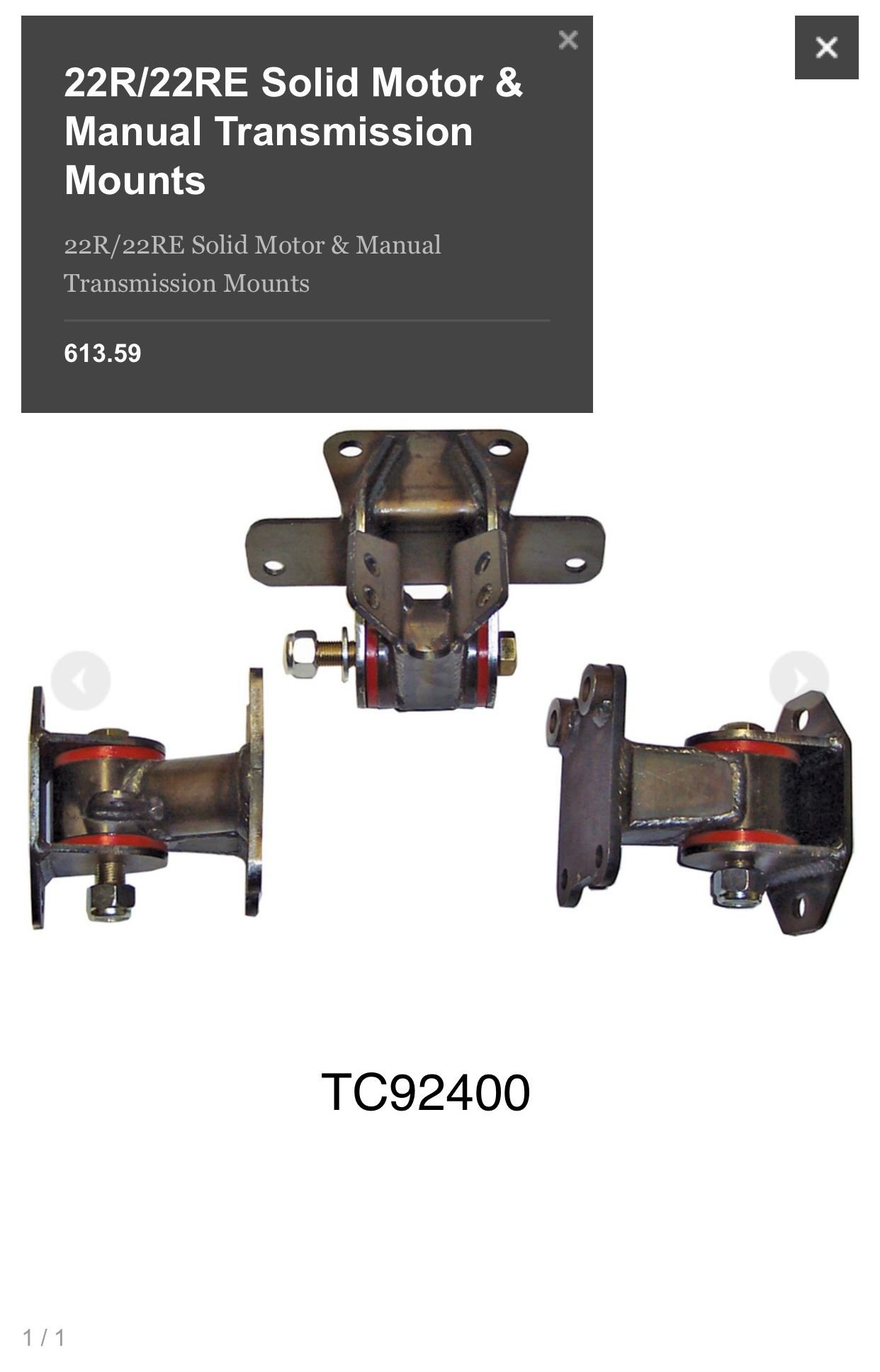 Thanks, this is at least a new contact, I’ll inquire with them to see if they might make/make me something. Also lead time is not an issue. I’m a patient person. Unfortunately it looks like this company is aimed towards 4WDs, like most. The issue I’m having is finding the transmission mount, rather than the engine mounts. And I don’t want to swap mounts on one without swapping mounts on the other.