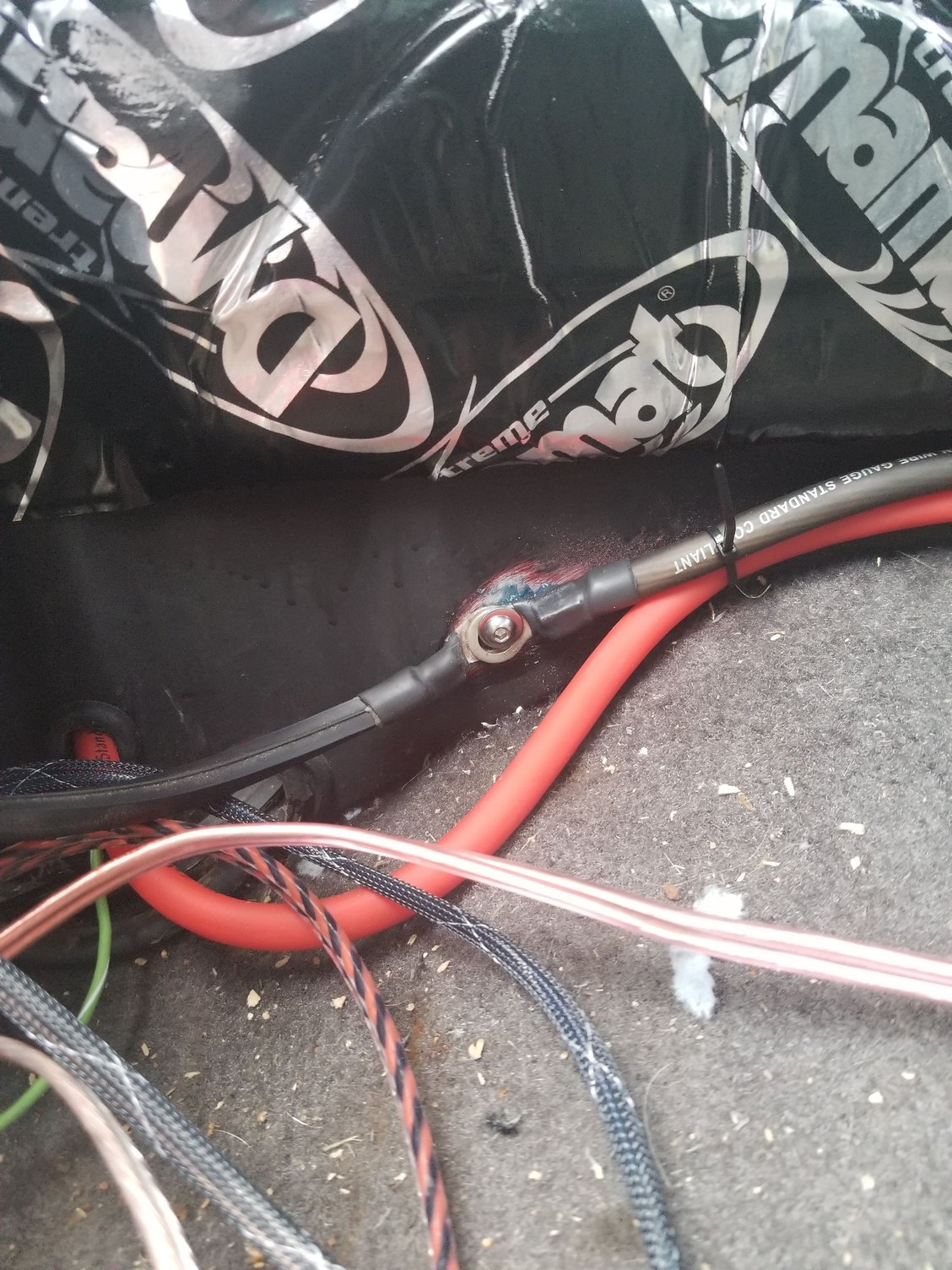 I fixed my ghetto power situation, and installed 4ga power and ground from my 2nd battery, located in the bed of the truck. Hopefully I can find an indoor shop soon to build me a box and get some cable management done! Cab ground for 2nd battery, also serves amp ground. Using 10-32 threaded insert for mount. Removed and replaced cab plug with grommet for pass through Final dress if power cables, left the loop to pull amp for maintenance later on, will be using different amp