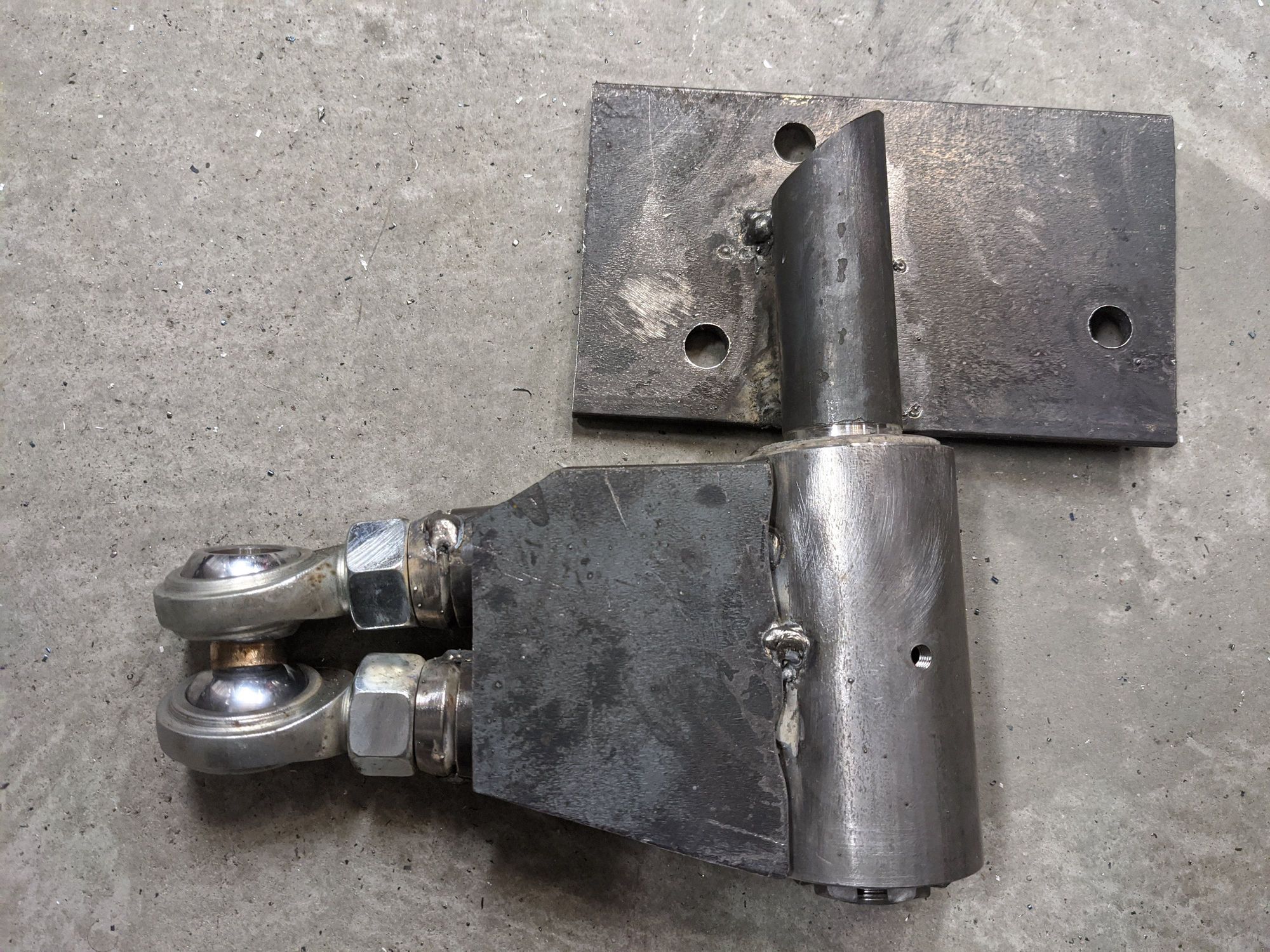 Here you can see the simple mount. And gusset. I am using 1/4" steel. I had to cut the spindle top to be able to mount the spindle as high as I need it and clear the bolt. I could have made my arms another 3/4 longer and move the whole thing further back on the plate. The spindle would clear the bolt. BUT, I decided the arm being short is important. I did have to make sure radius was enough not to mess up the steering geomtery. Also, I decided a gusset on one side was more than enough.
