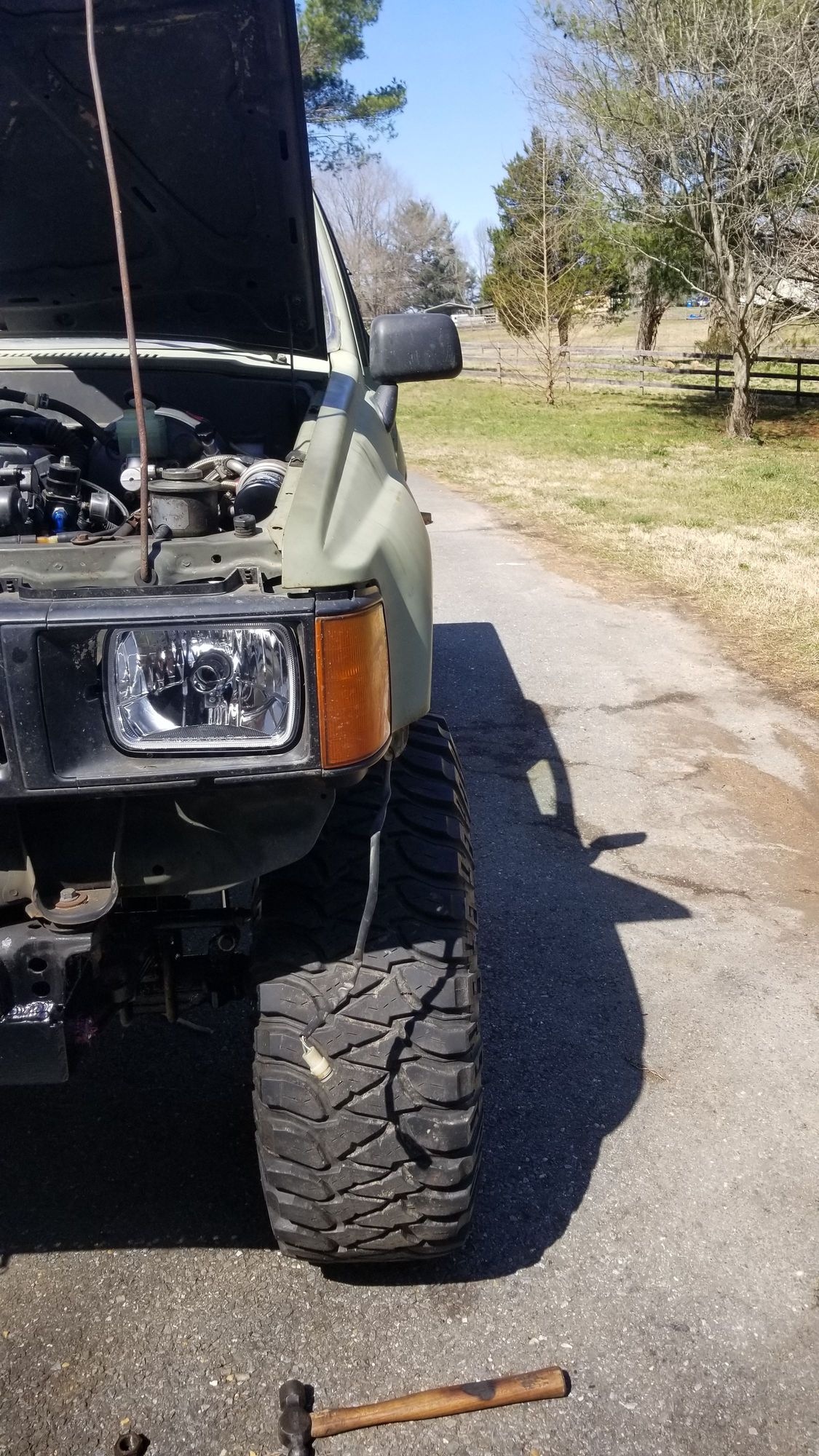 Rolled the Runner outside to get a look at it and immediately noticed something was off. The passenger side tire was sticking past the fender by 1 inch more then the driver and was like wtf is going on now lol.