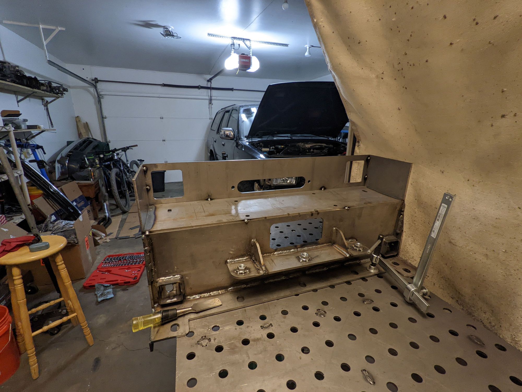 Back of it all tacked into place with the front winch plate in too where a fairlead will mount to