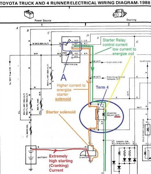 1988 Runner start relay control current and higher current to energize starter solenoid both pass through ignition key "start" contacts, the contacts that the starter relay was meant to protect from the higher current :O
