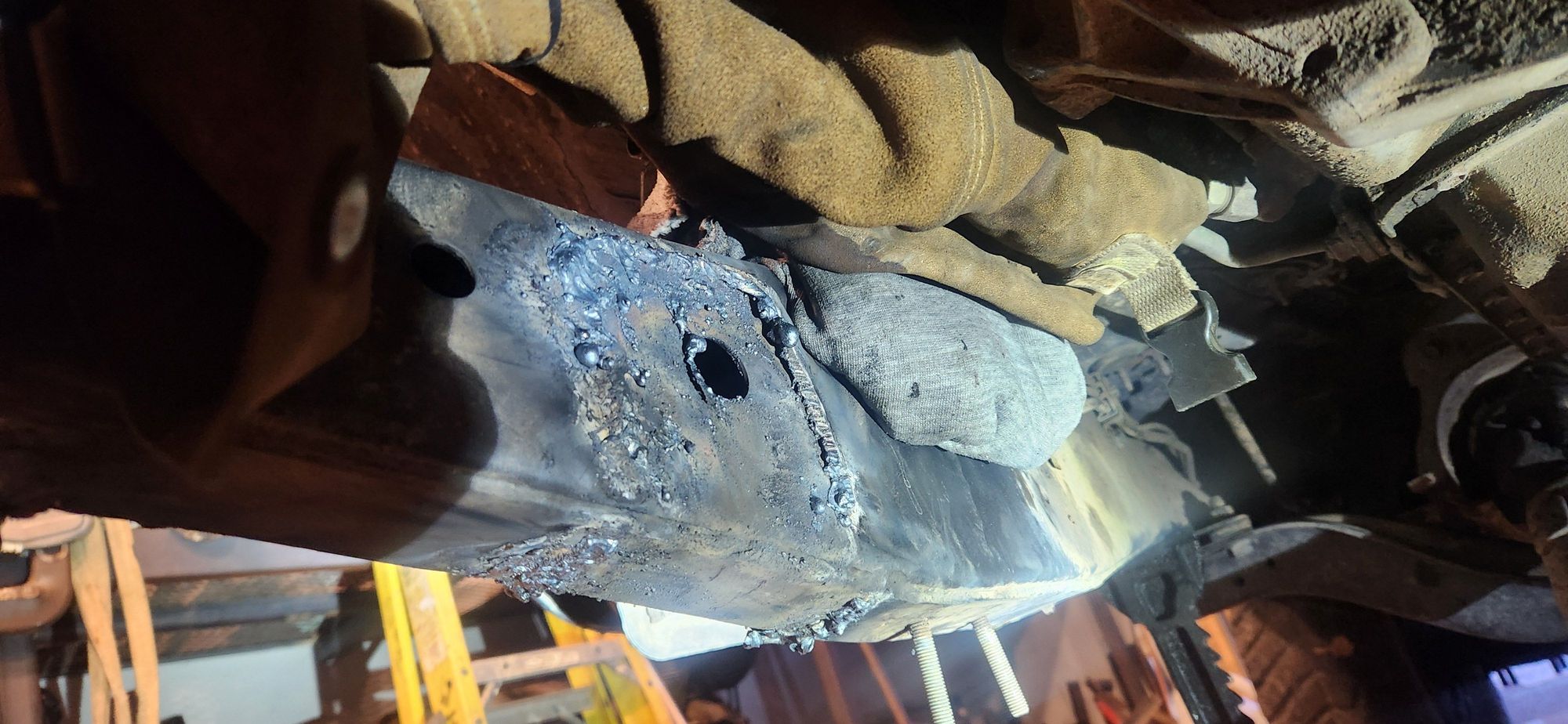 This was the most difficult spot of the entire cutting process. The gas line right next to it and the auto trans cooler lines directly above it. With the rag three times on itself and dripping wet, and the lower half of a pair of my leathers on the trans lines i was able to get in and get what i needed cut off with the torch. More that gets torched off the less grinding to do.