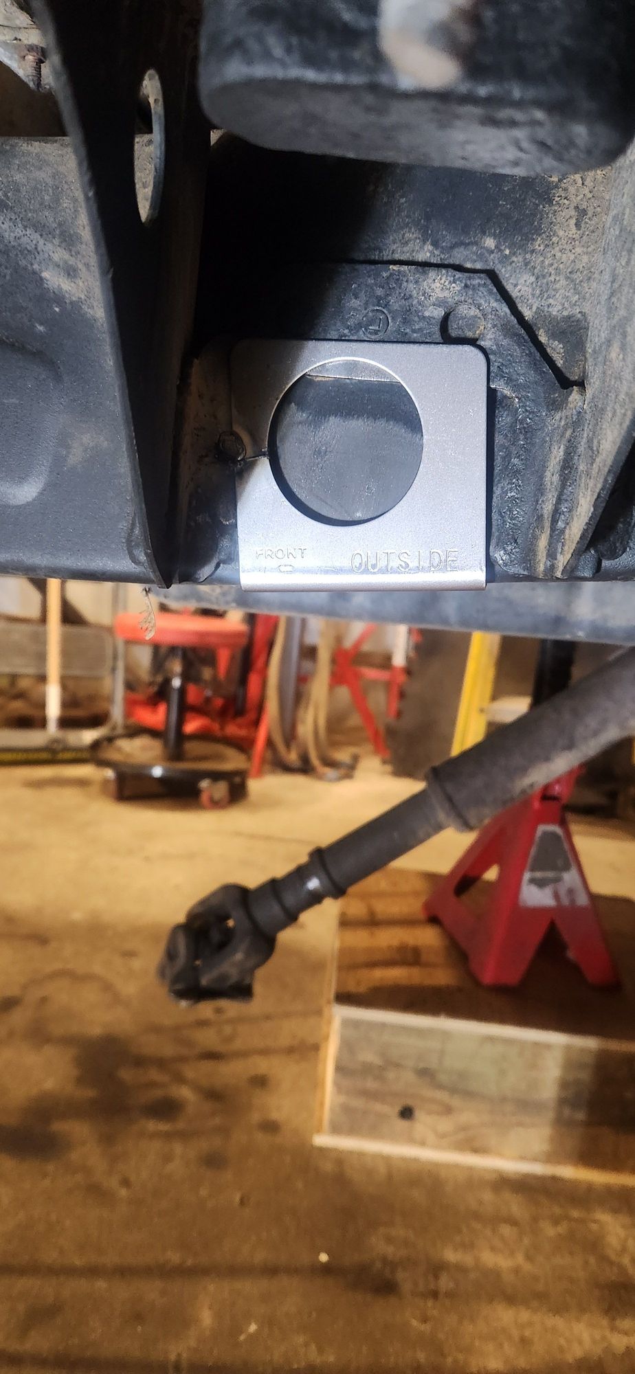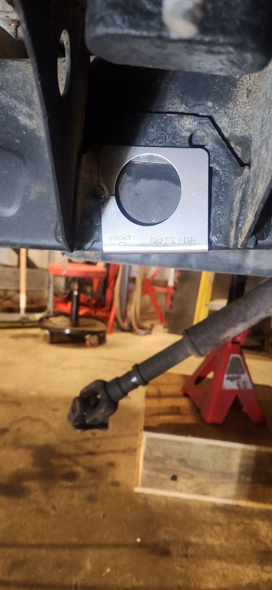 Frame tube jig. Centered between the body mount. Used the body mount to get them close then squared them off the front leaf spring hanger to confirm. Debated using a hole saw but went with a torch for 3 of the 4 holes. Torched the outside frame rail first on passenger and drive side. The inside rail would prevent the torch from catching something on fire while i was on the other side of the frame.