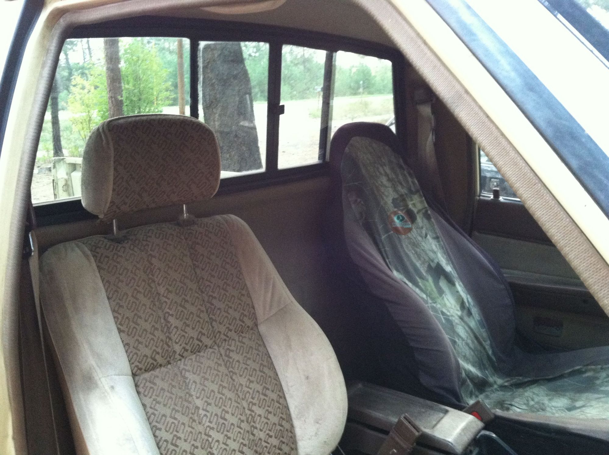 sr5 seats! But the driver's side has zero cushion left. I'm sitting on the rail. Maybe junkyard yota seats in the future. Center console hinge is busted and the top is pretty nasty. Read window works about as well as you'd expect for this age.