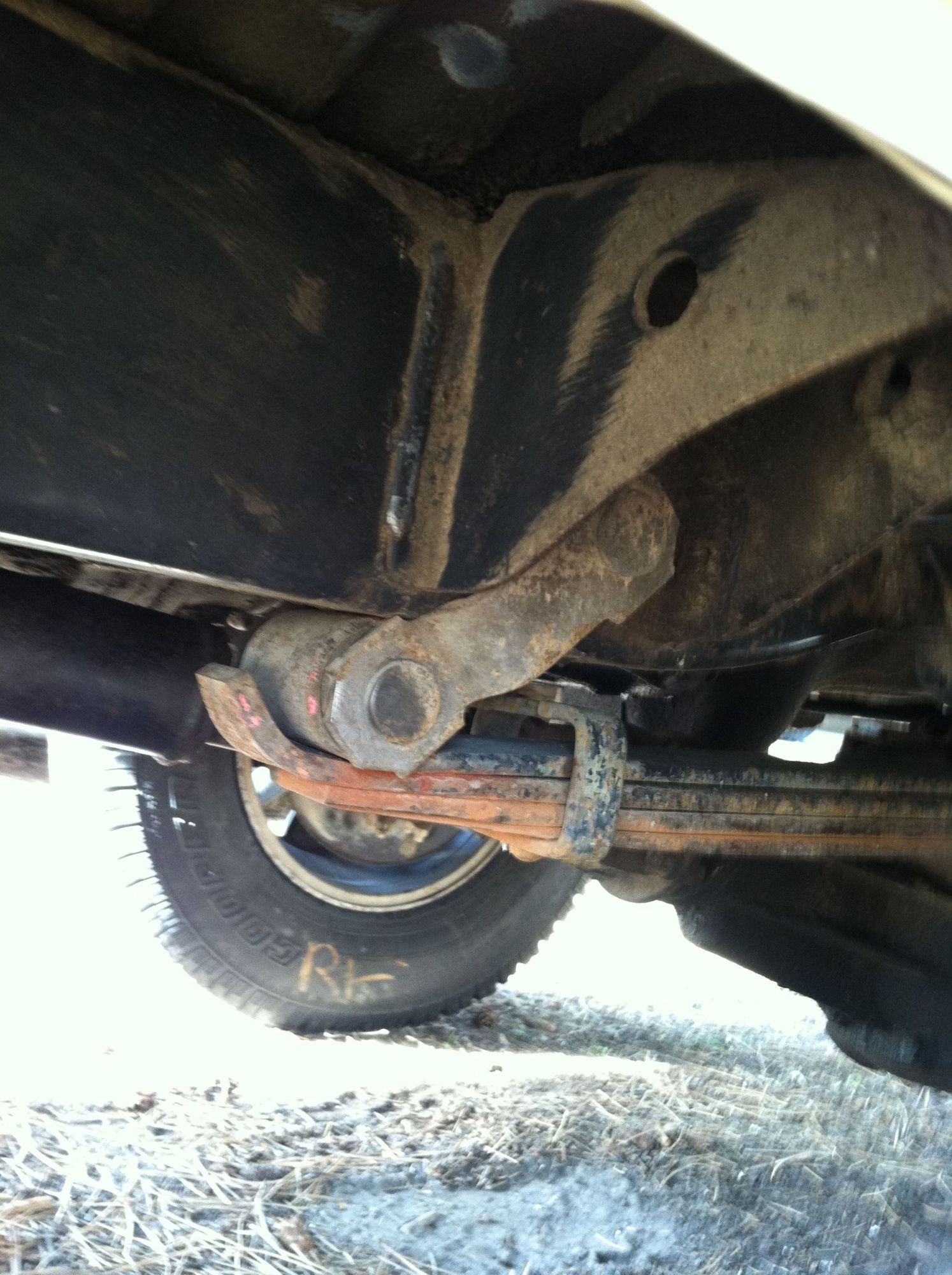 Front leaf spring shackle swings back and allows leaf to rest on the frame. Not cool. Got some junk spring packs and hopefully i can put together a "b*stard leaf pack" to lift it a bit and get the shackles some clearance.