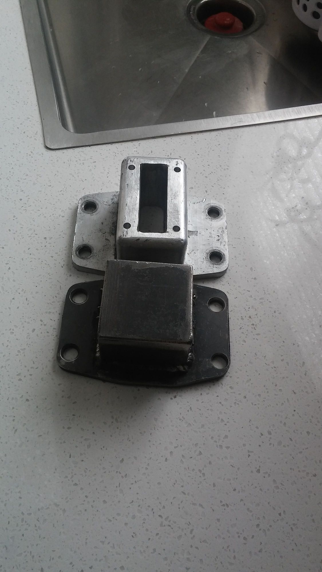 I used the Sky plate as a template to cut my new plate out of 3/16" steel. (You'll see the bottom hole in later pics.) Then for the top cube portion i used 1/8" 2"x2" angle iron. I think they were 1.375". Then. I welded them together like this: L7. And then simply cut a piece of plate to cap it off.