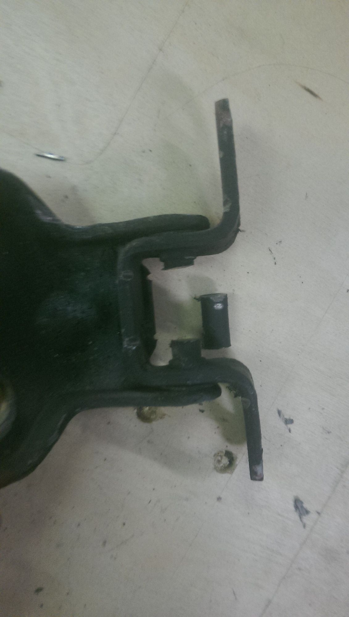 center section of the pin cut out to allow me to pound the heck out of it with a punch slightly easier. When using a punch and hammer to get what little short sections of the pin are left out of it, be careful not to distort / bend the bracket out of shape too badly (vise helps a lot)