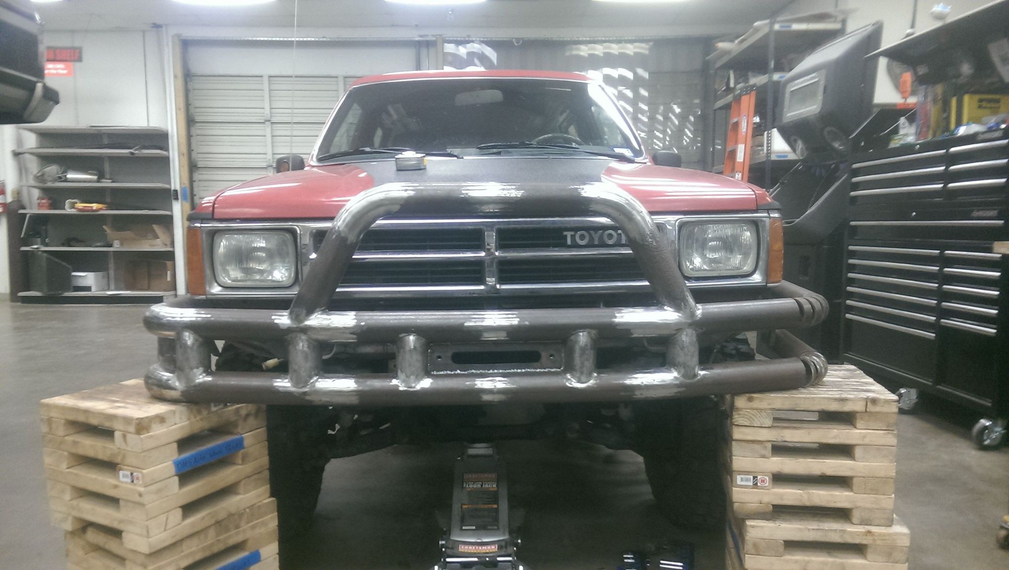 looks ready for some zombies. I didn't have the right jacks to get the bumper at the exact height and level, so I put it on these blocks and lifted the front end of the rig up so it was in place. For the final weld up when tacking on the winch plate and other supports, I think I'm going to hang it from an overhead gantry with the now infamous red ratcheting straps so I can get the whole thing perfectly level and square to the vehicle (jacking up the front end threw off the angle).
