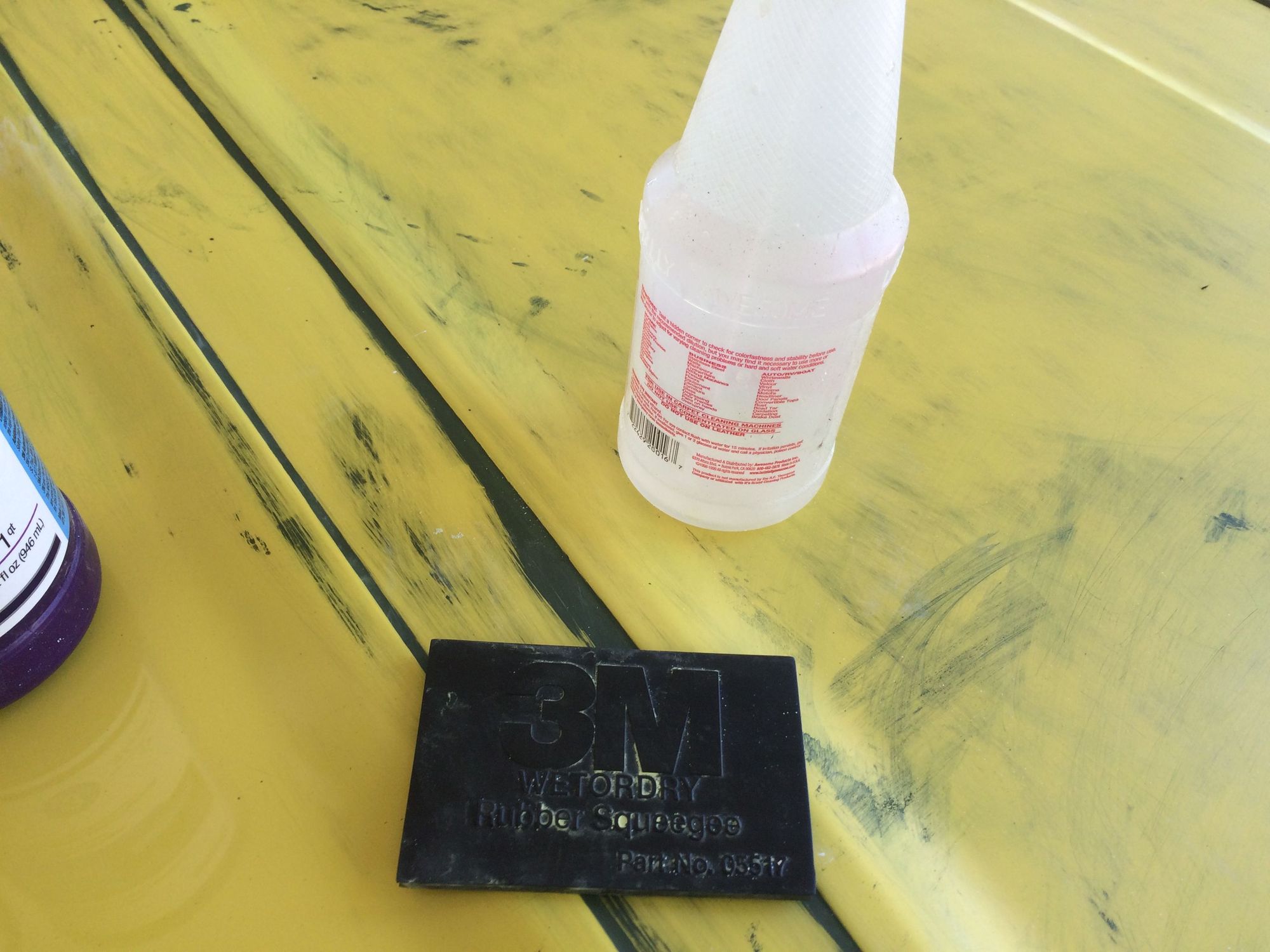 A drop of dish soap in a spray bottle with water help by not making such a mess as a bucket full of water. The small amount of soap helps lift the old paint away from your work area. A 3m squeegee is great for keeping the area your working on free from debris and helps you see where you need more sanding. Normally I would use an engineering fluid called Dykem between grits but I can see well on this color without it