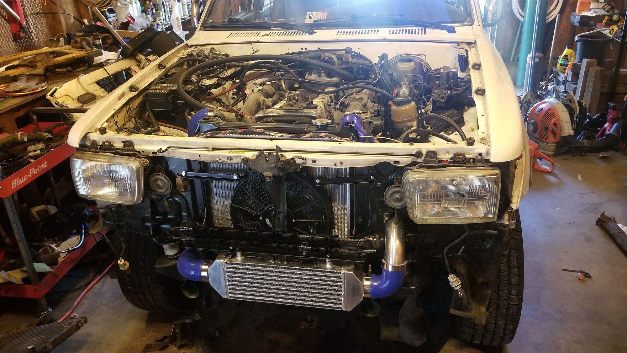 Here you can see power steering cooler bolted up above the intercooler as well as the elctric fan. I really do not like the plastic mounts for the fans that go through the radiator fins and press the fan against it. So i mounted to the core support instead. Physically and cant go anywhere and the bracket helps keep it blowing against the radiator.